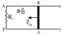 που βρίσκονται πάνω σε οριζόντιο επίπεδο, όπως φαίνεται στο σχήμα, απέχουν μεταξύ τους απόσταση l = 2m και τα άκρα τους Α και Γ συνδέονται με σύρμα αντίστασης R1. Μεταλλικός αγωγός ΚΛ μήκους l = 2m, που βρίσκεται σε μεγάλη απόσταση από τα άκρα Α και Γ, είναι κάθετος στους δύο αγωγούς Αx και Γy και μπορεί να ολισθαίνει πάνω τους χωρίς τριβές. Ο αγωγός ΚΛ έχει μάζα m = 2kg και ωμική αντίσταση R = 2Ω. Η διάταξη βρίσκεται μέσα σε κατακόρυφο ομογενές μαγνητικό πεδίο που έχει φορά προς τα πάνω και μαγνητική επαγωγή Β = 1Τ. Ο αγωγός ΚΛ αρχικά ηρεμεί. Τη χρονική στιγμή t = 0 δίνεται στον αγωγό αρχική ταχύτητα υ0 = 12m/s. α. Να βρείτε την τιμή της αντίστασης R1, ώστε το ρεύμα στο κλειστό κύκλωμα τη χρονική στιγμή t = 0 να έχει ένταση Ι0 = 3Α και να υπολογίσετε τη θερμότητα Joule που αναπτύσσεται στο κύκλωμα μέχρι τη χρονική στιγμή που η ένταση του ρεύματος γίνεται Ι = 1Α. β. Όταν το ρεύμα πάρει την τιμή Ι = 1Α, ασκείται κάθετα στον αγωγό κατάλληλη, οριζόντια, εξωτερική δύναμη